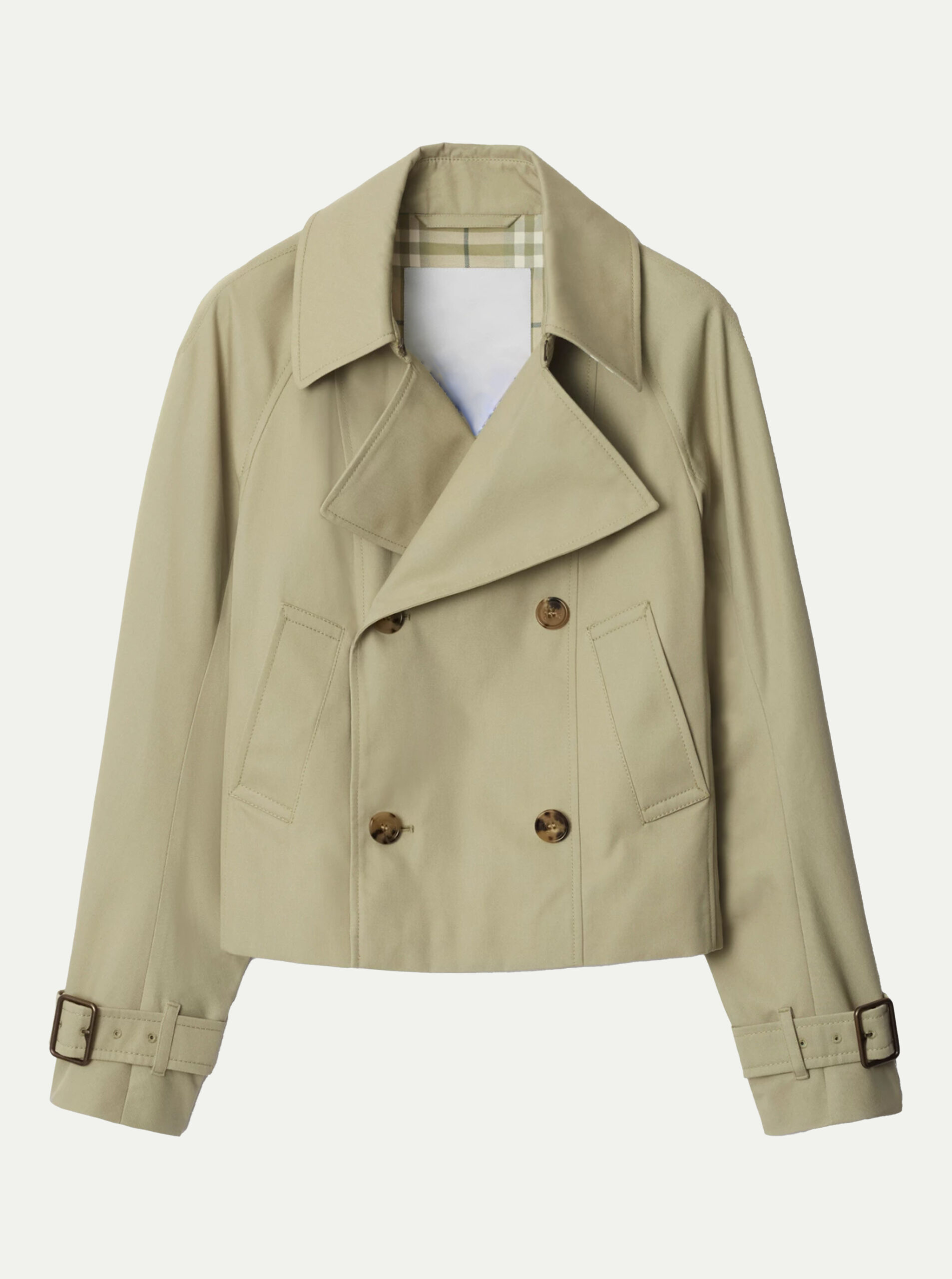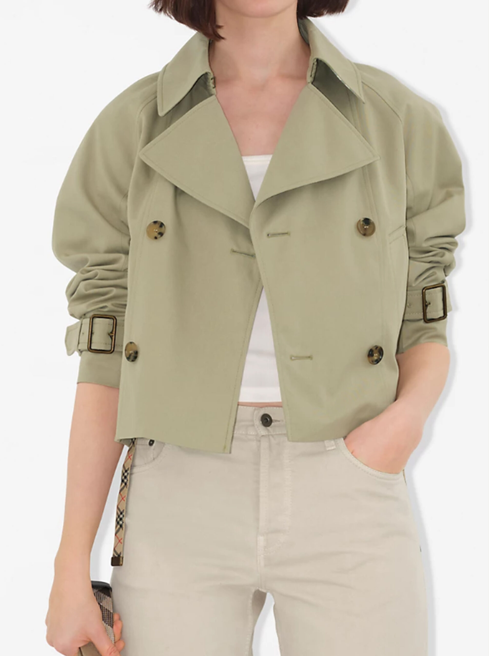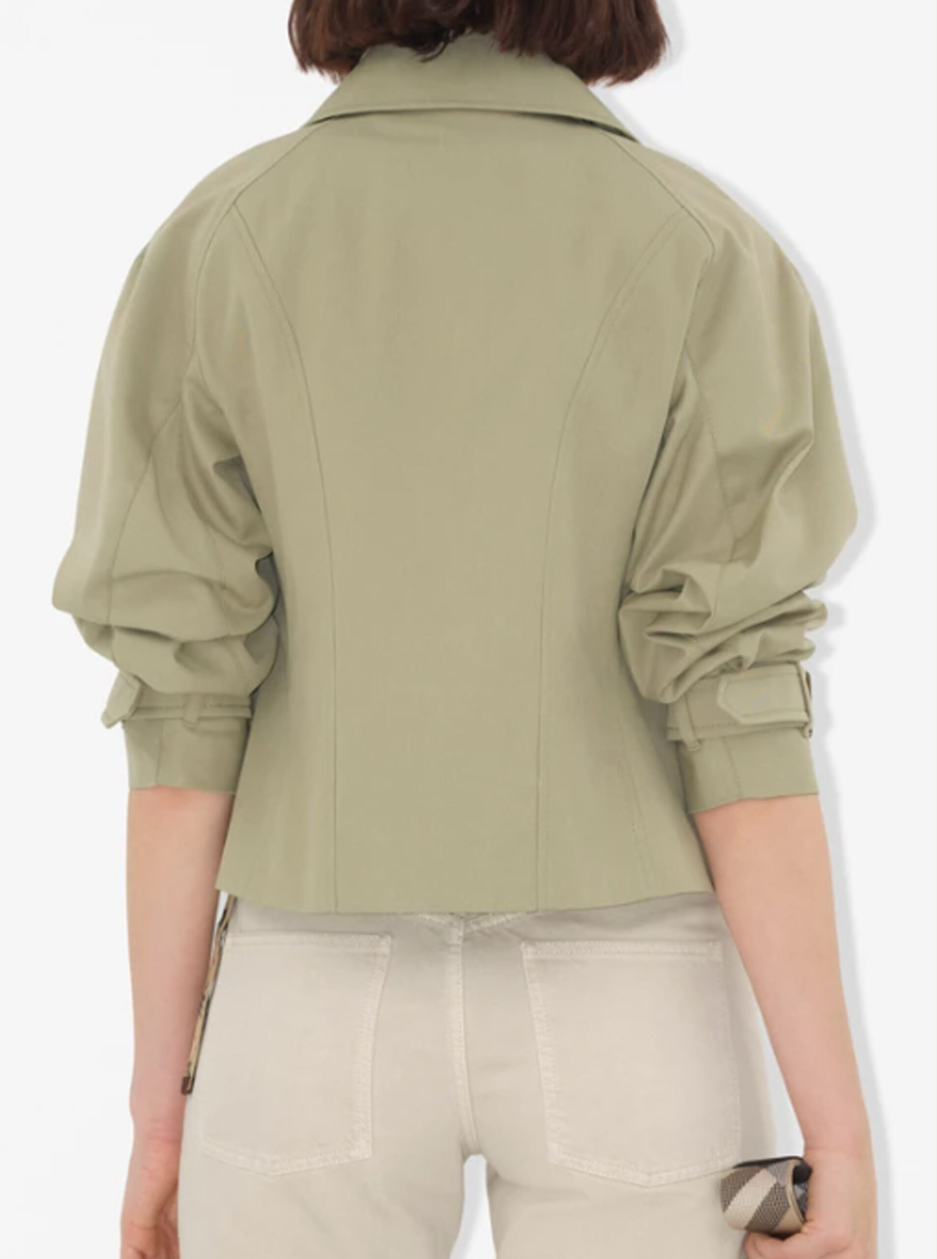 Crafted from durable cotton-blend gabardine, it features a cropped silhouette, structured shoulders, and belted cuffs for a polished yet contemporary finish.