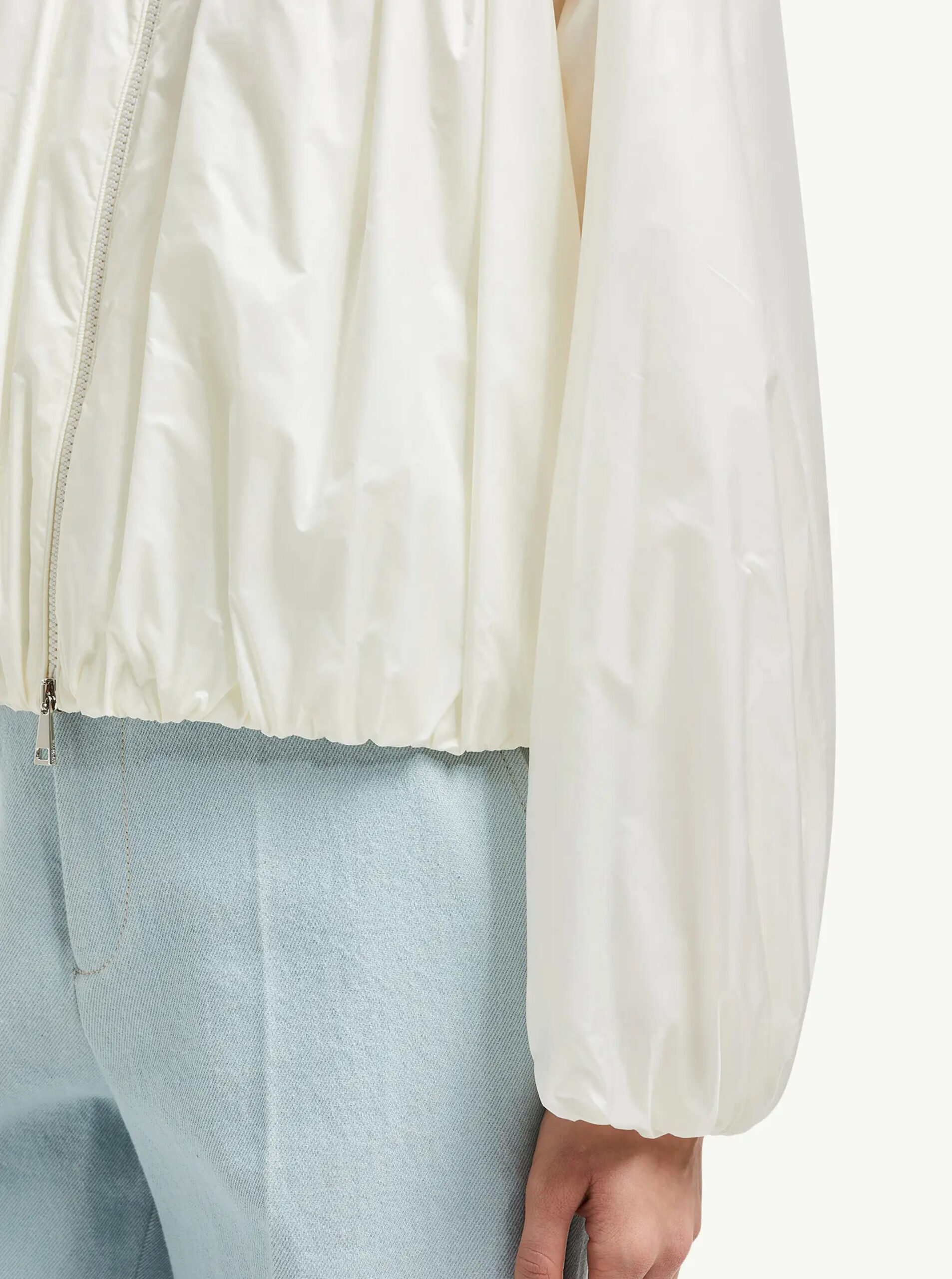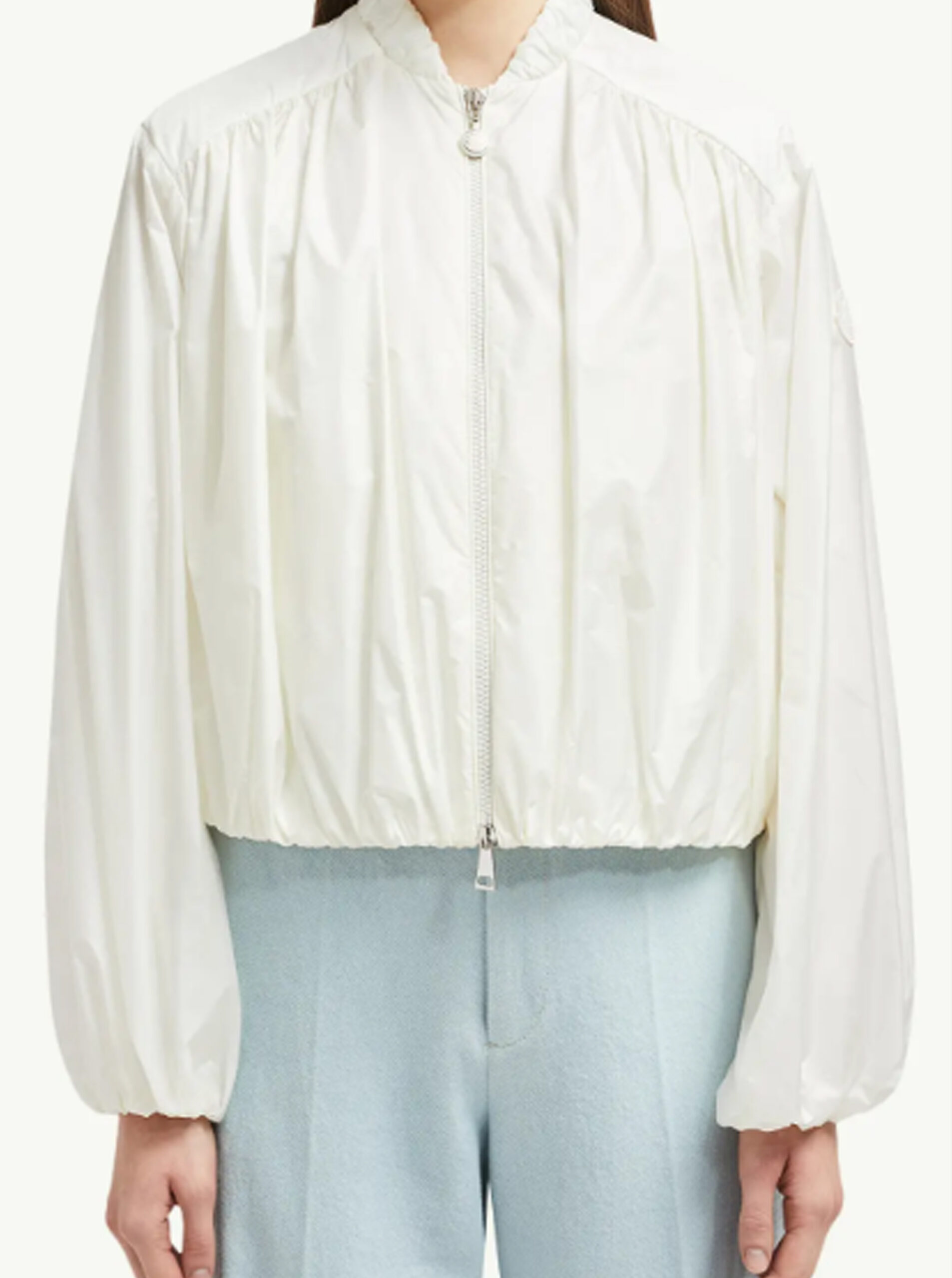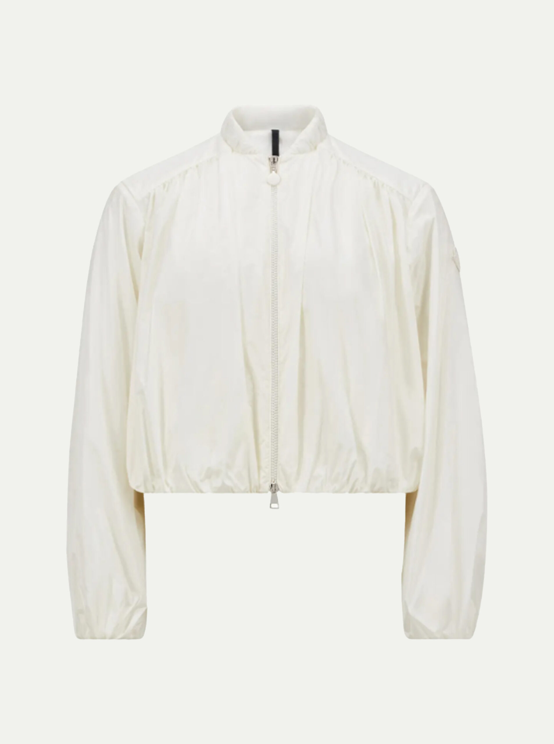 Crafted from smooth, lightweight nylon, it features subtle gathered detailing at the shoulders and an elasticized hem that enhances the cropped silhouette.