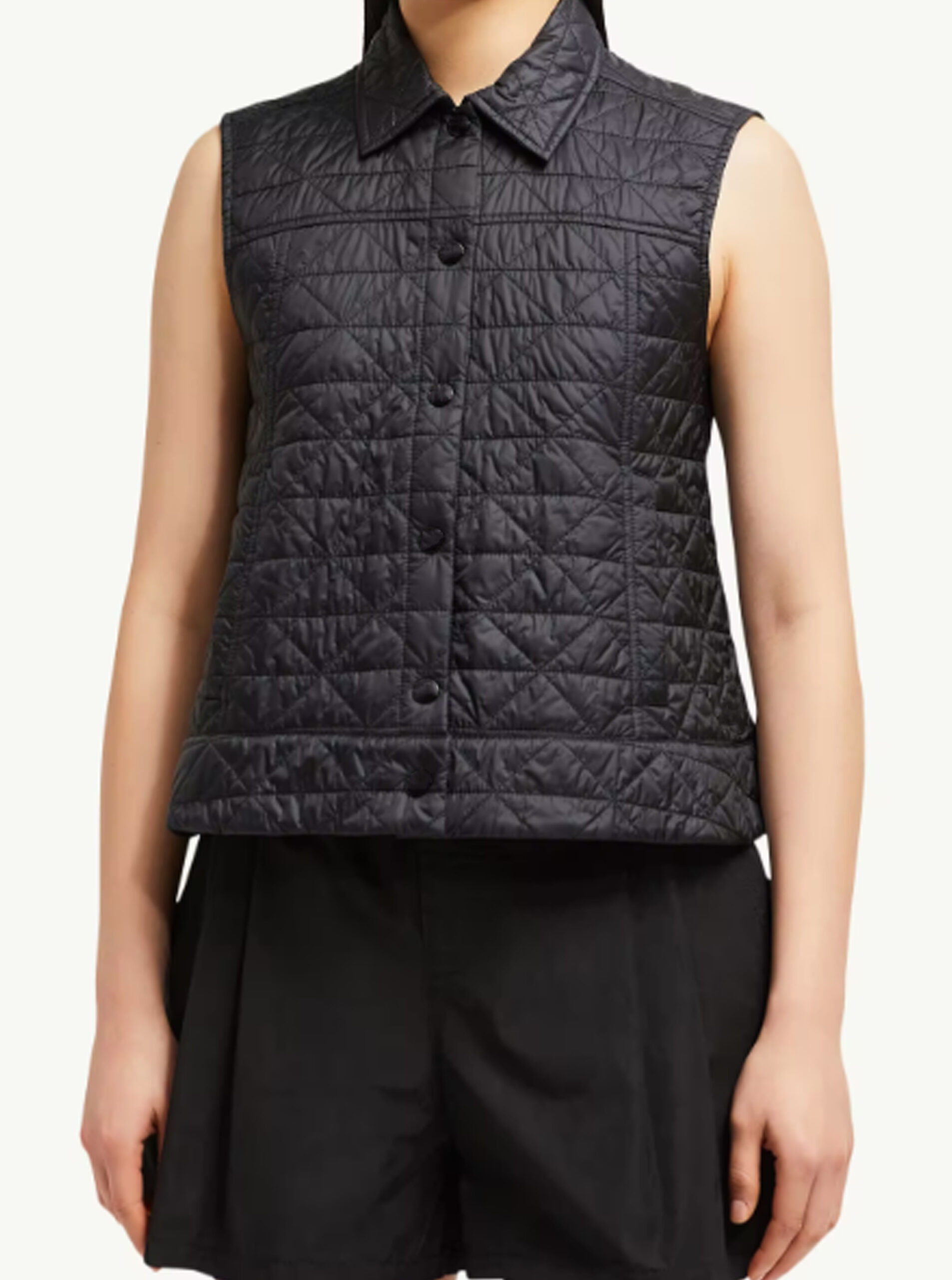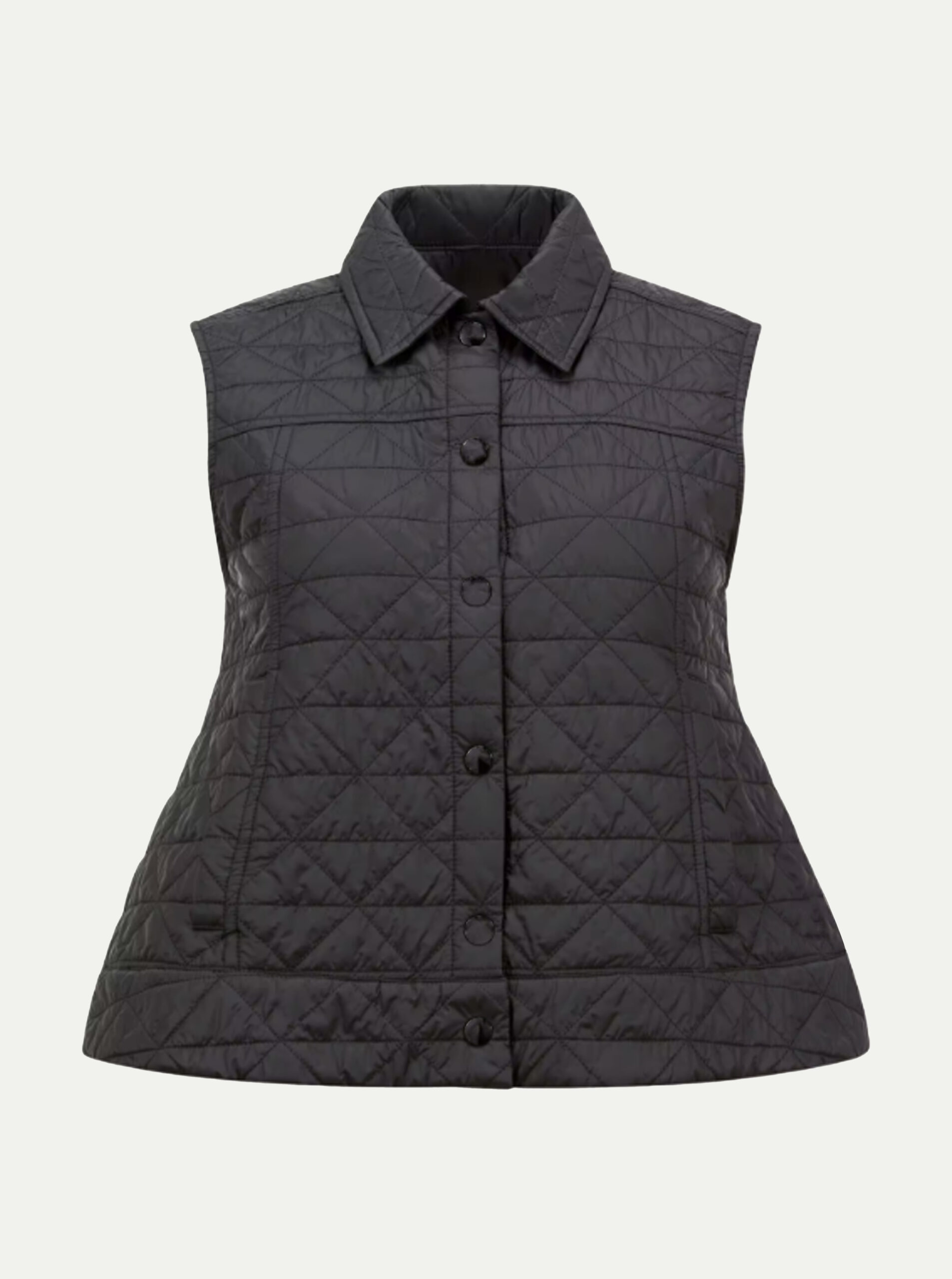 Elevate transitional layering with this Diamond-Quilted Button-Front Vest, designed with a refined shirt-collar silhouette and a subtly flared shape.