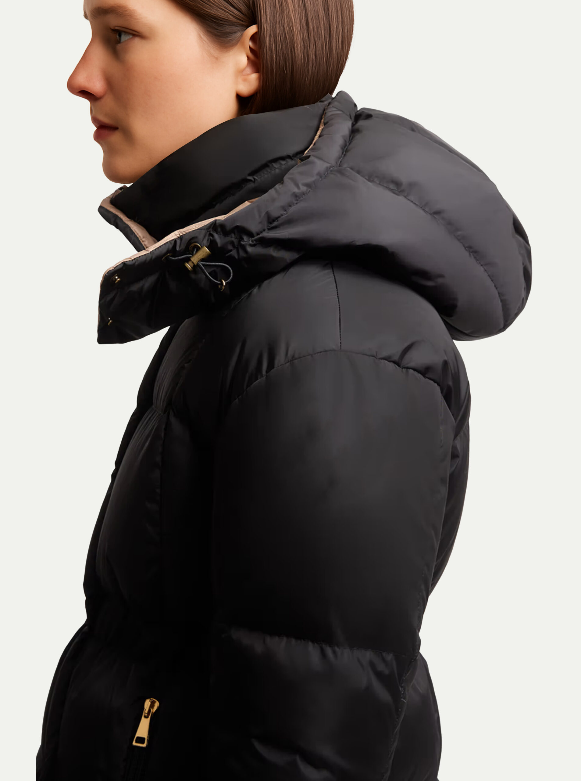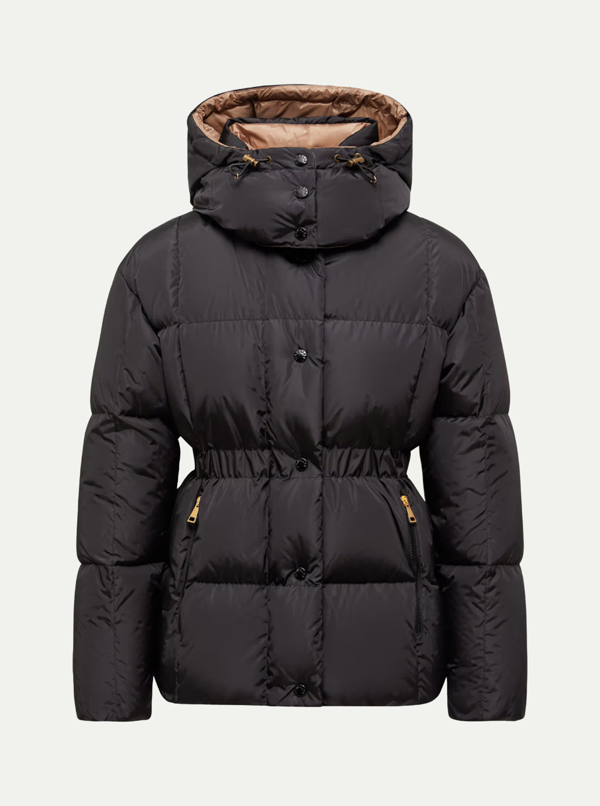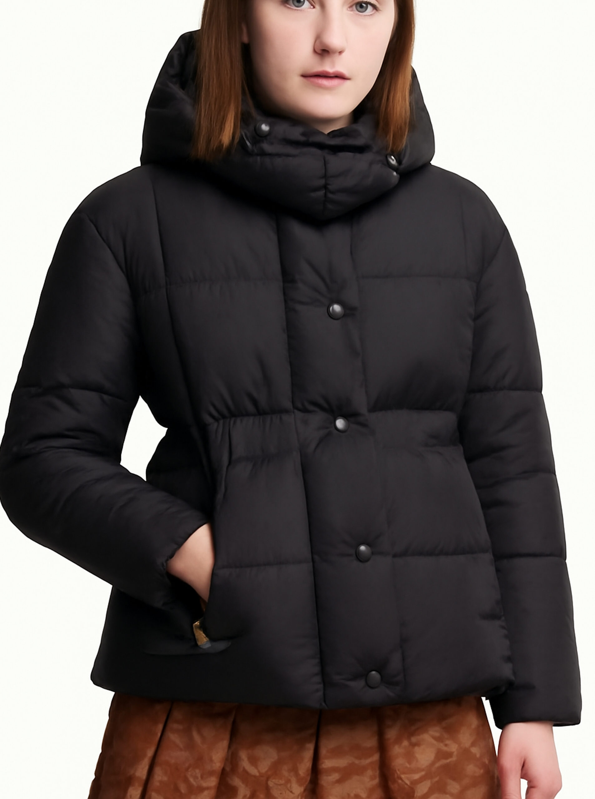 Elevate your outerwear collection with this Hooded Cinched-Waist Puffer Jacket. It features a structured silhouette with a drawstring waist, merging functional design with a polished aesthetic. The hood and tailored details make it a versatile piece for cold-weather styling, balancing warmth and refined look.