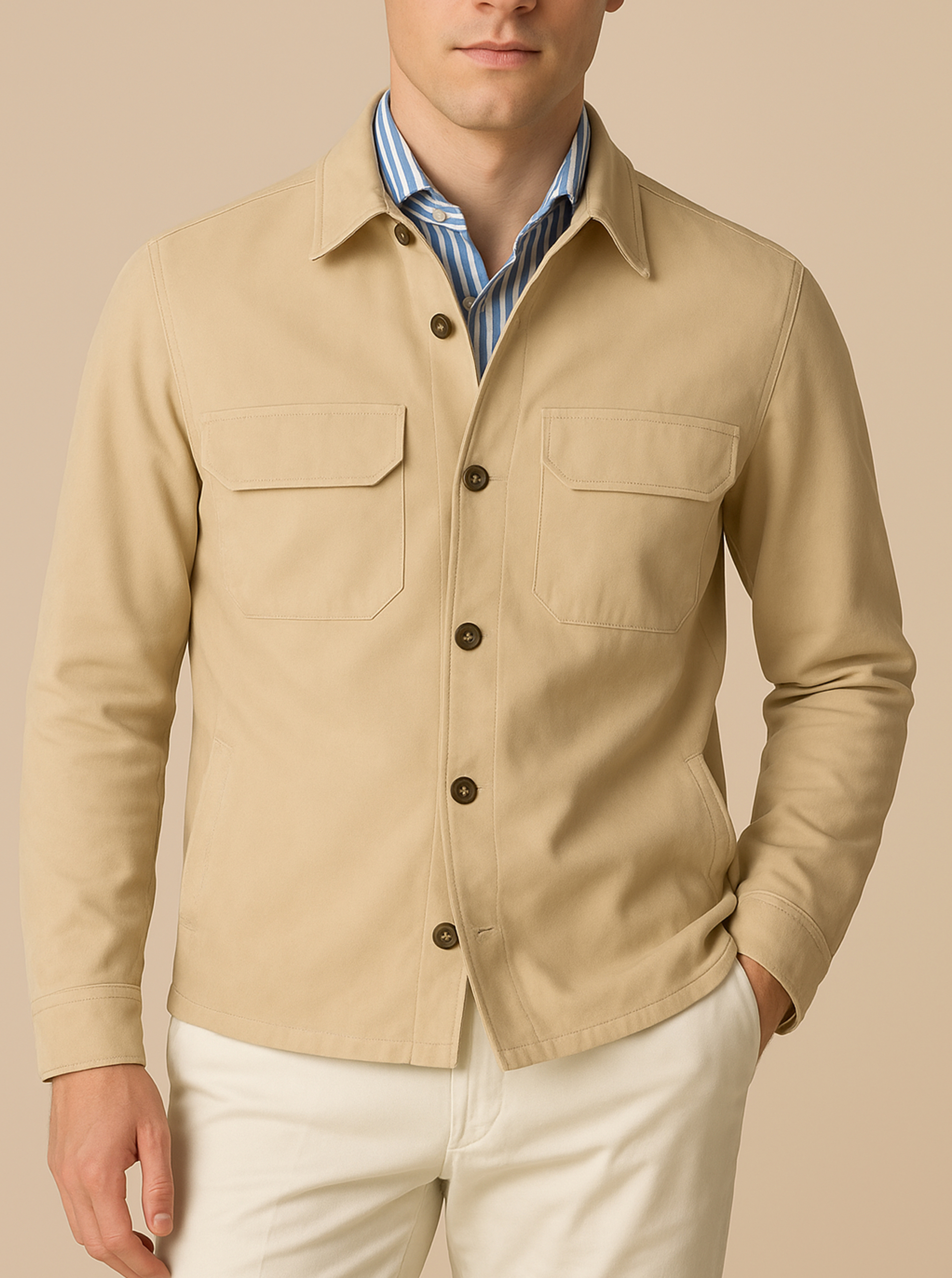 Cut in a relaxed yet tailored shirt-jacket fit, it layers effortlessly over tees or under heavier coats. The neutral beige hue complements countless outfits, from denim and knitwear to chinos and dress shirts, making it a versatile core piece in your wardrobe.