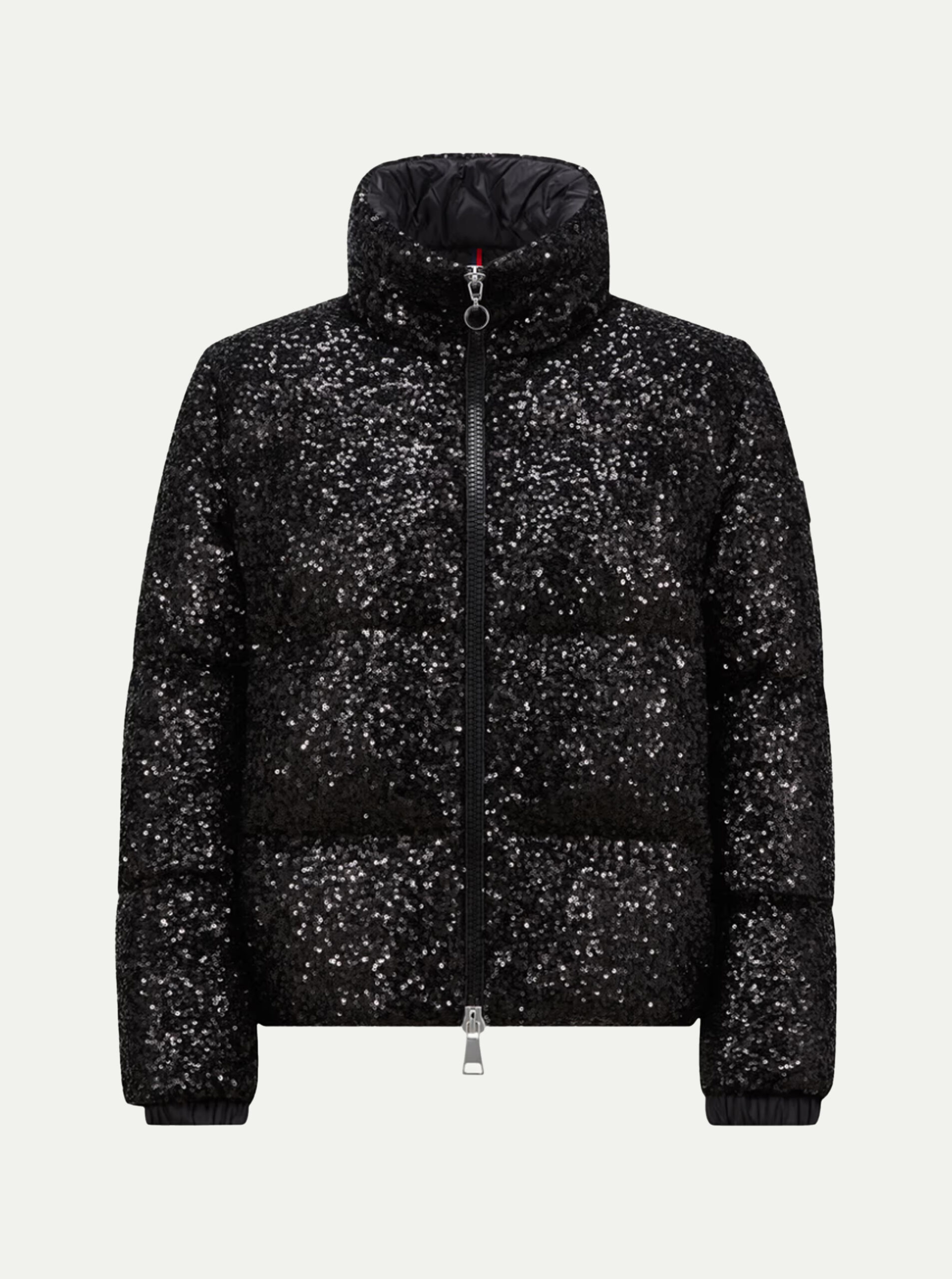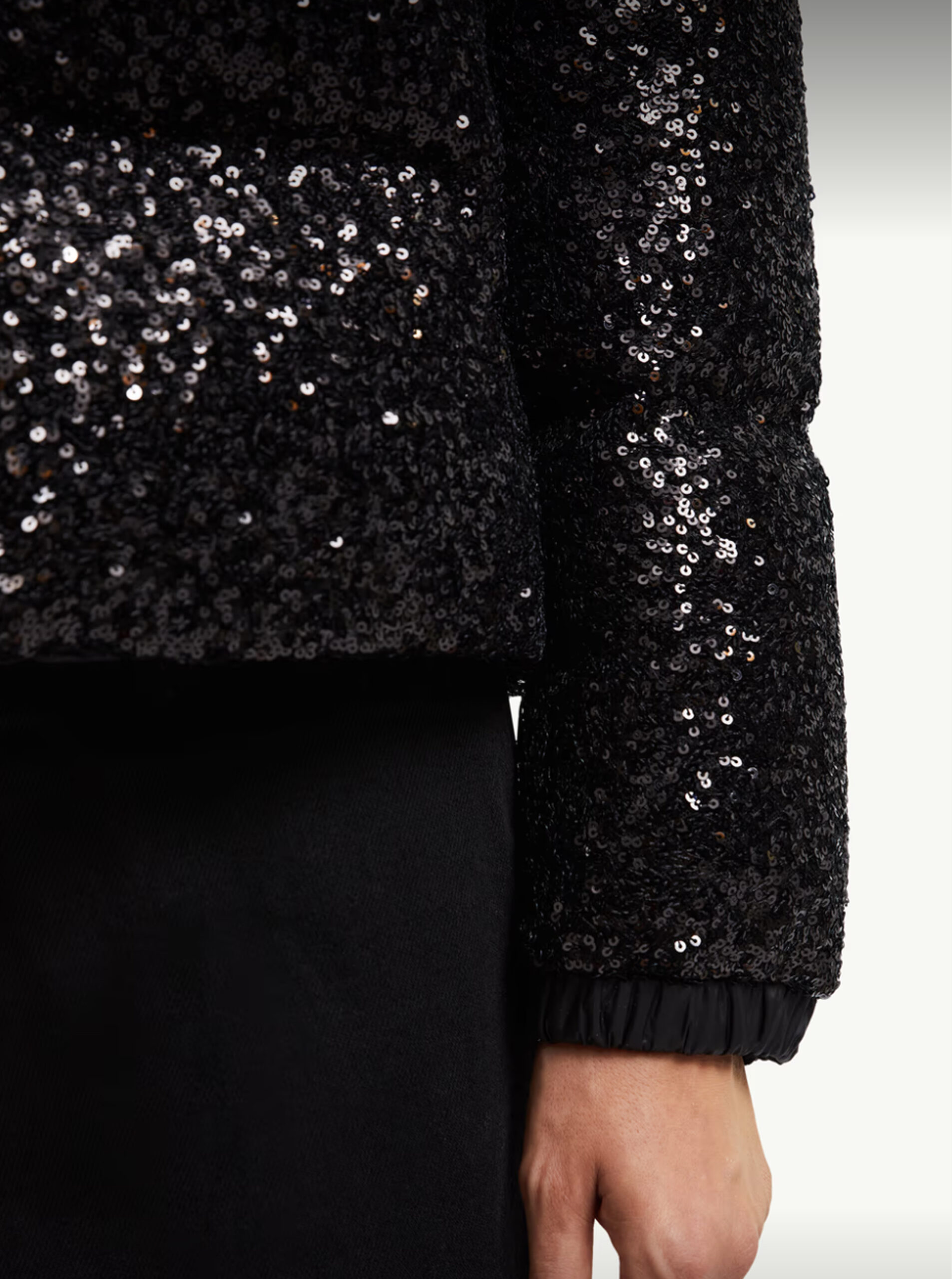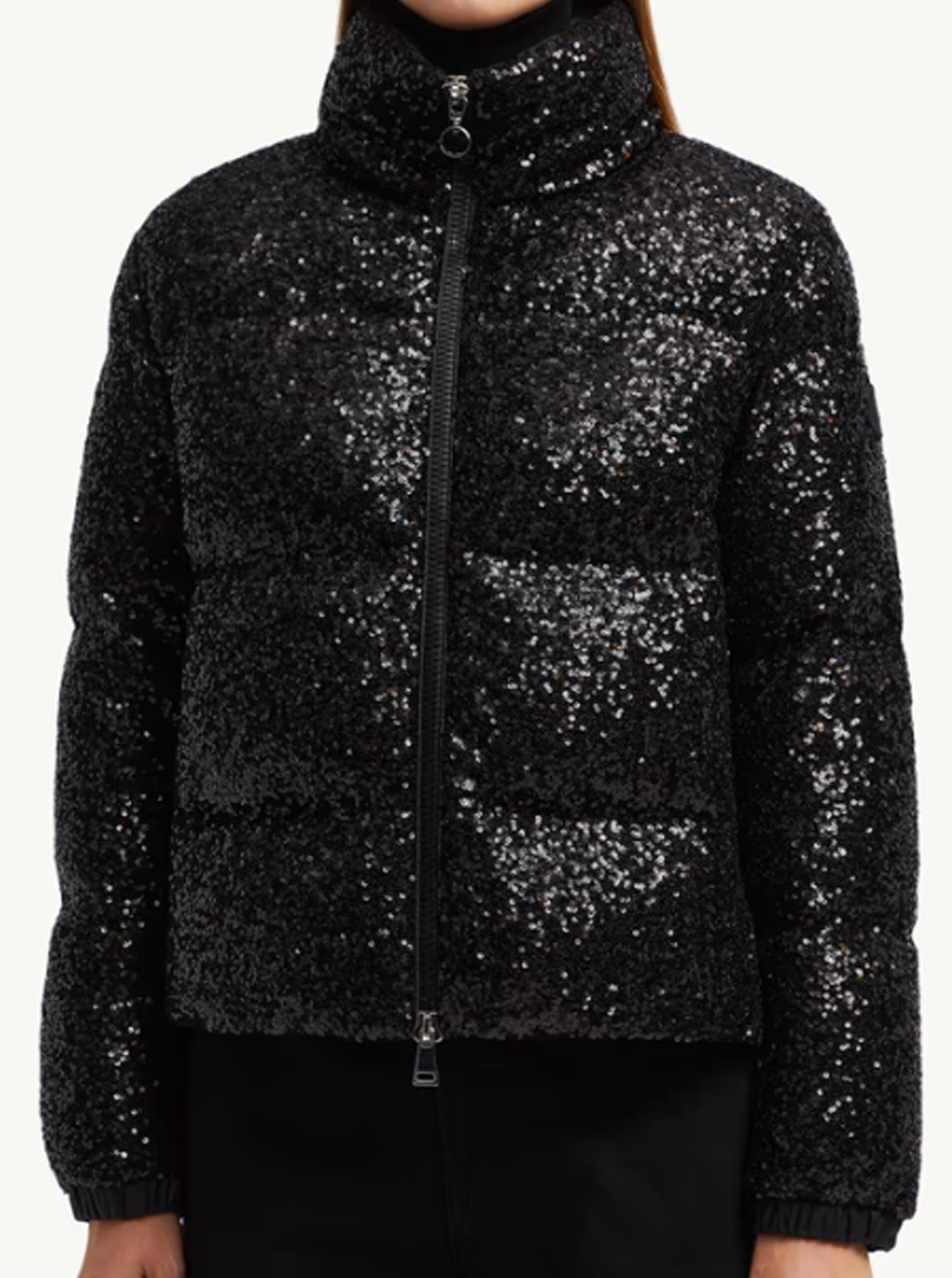 - Structured Puffer Silhouette: The tailored cut offers a balanced look, merging the drama of sequins with the practicality of a puffer.
