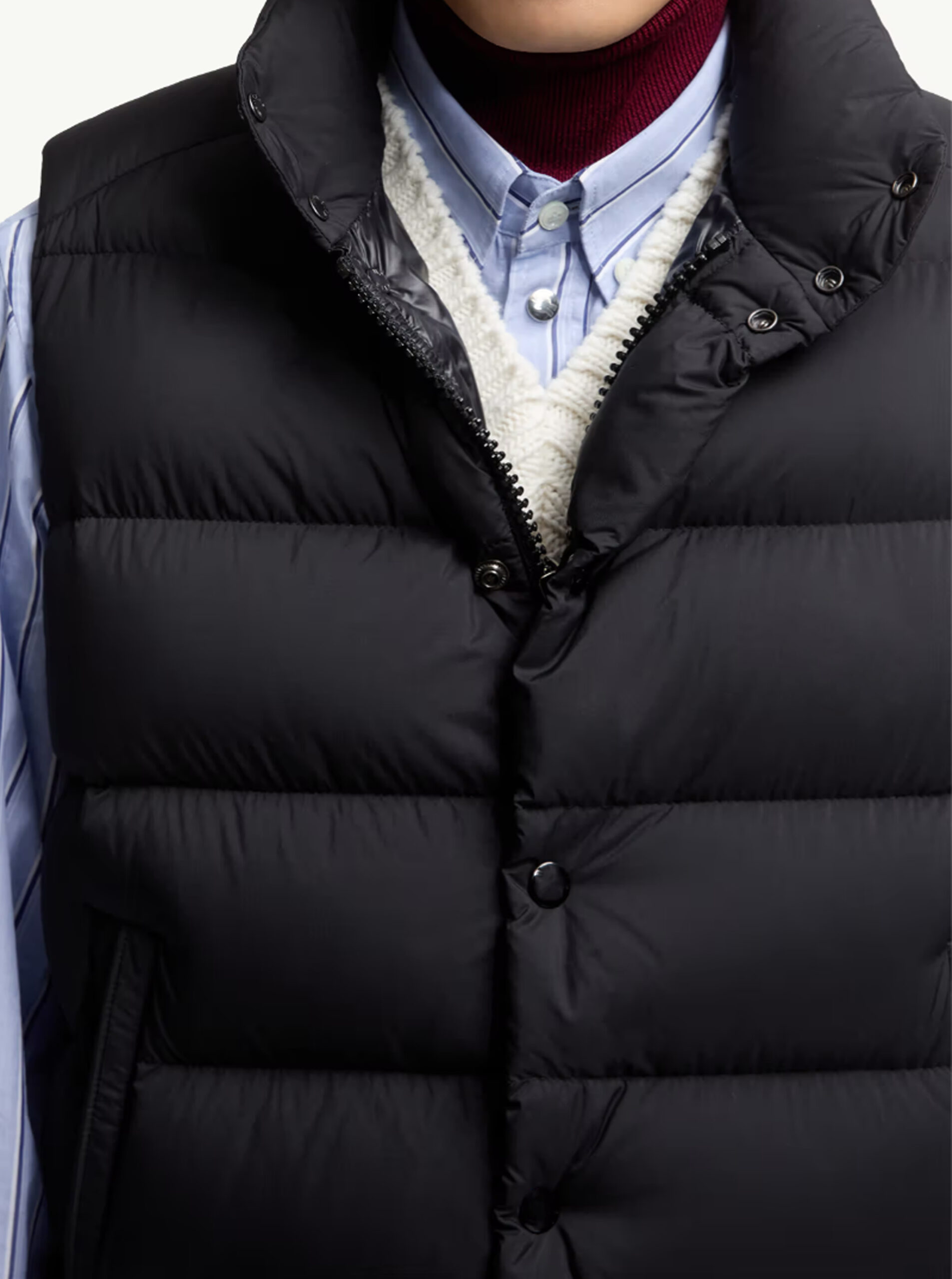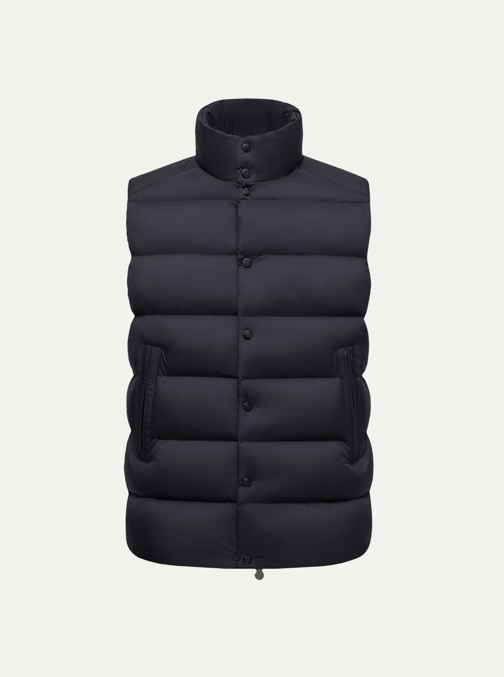 Elevate your cold-weather layering with this Stand-Collar Button-Front Puffer Vest, designed for lightweight warmth and clean structural lines.