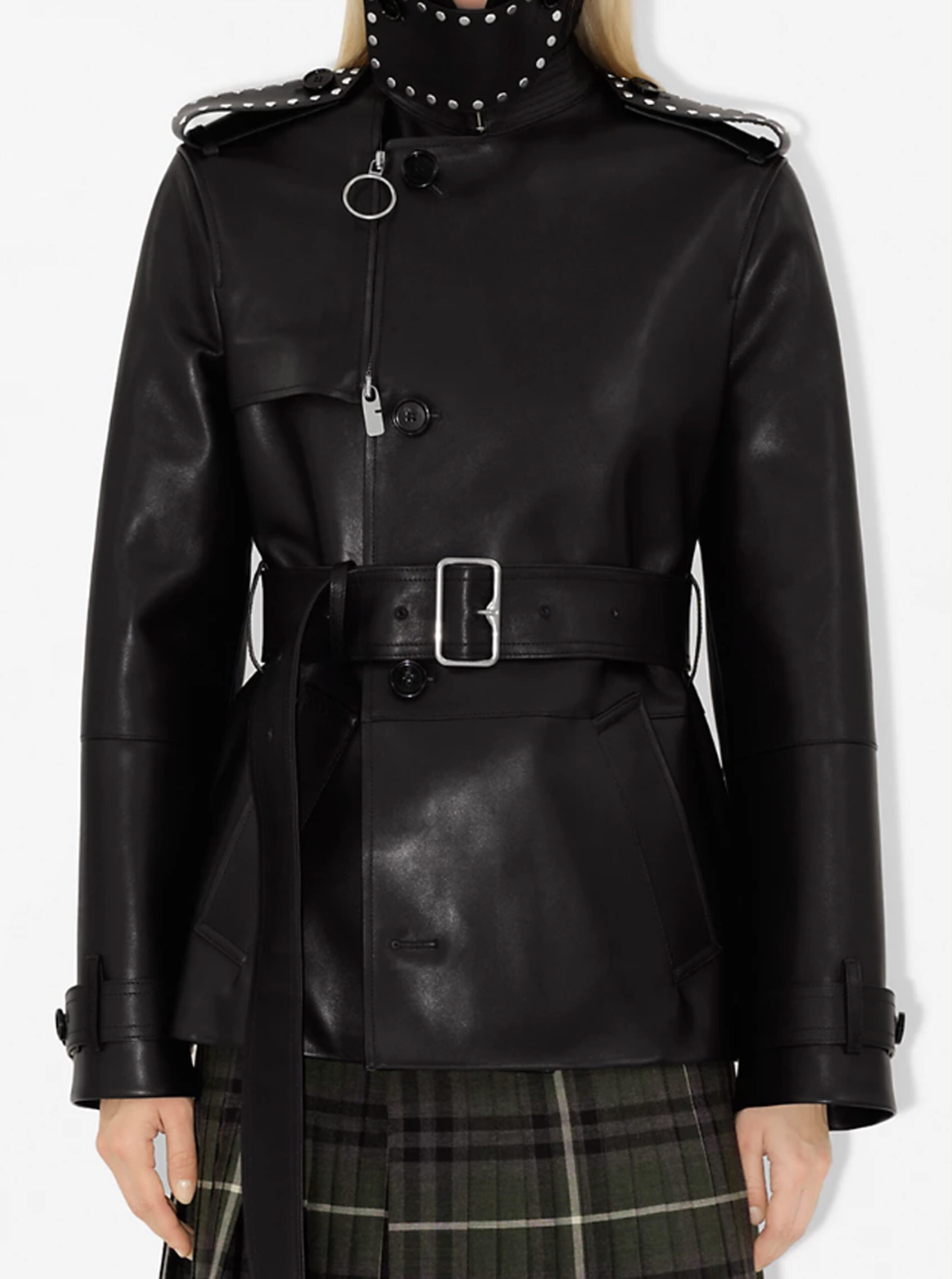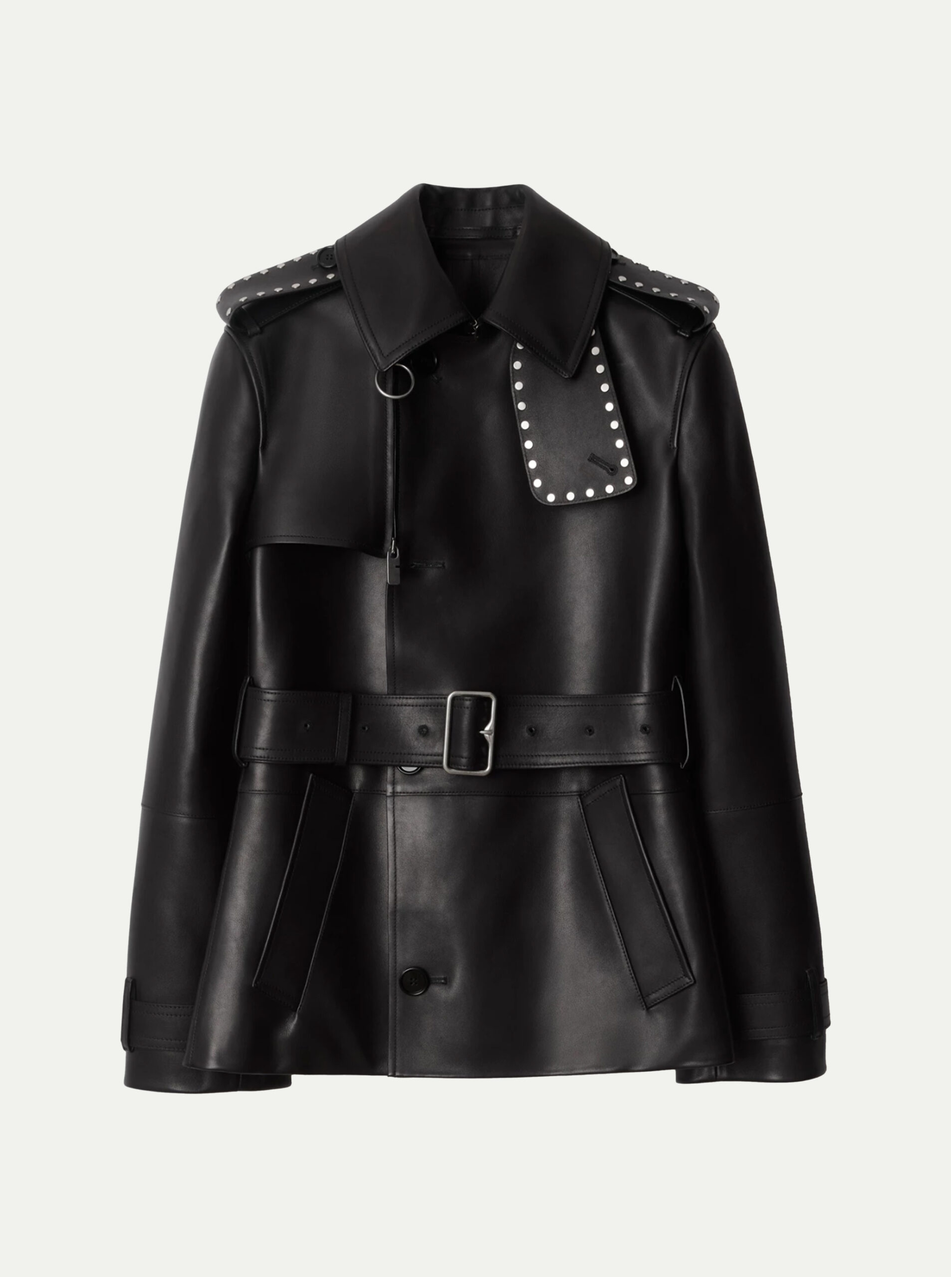 Studded Belted Leather Trench Jacket