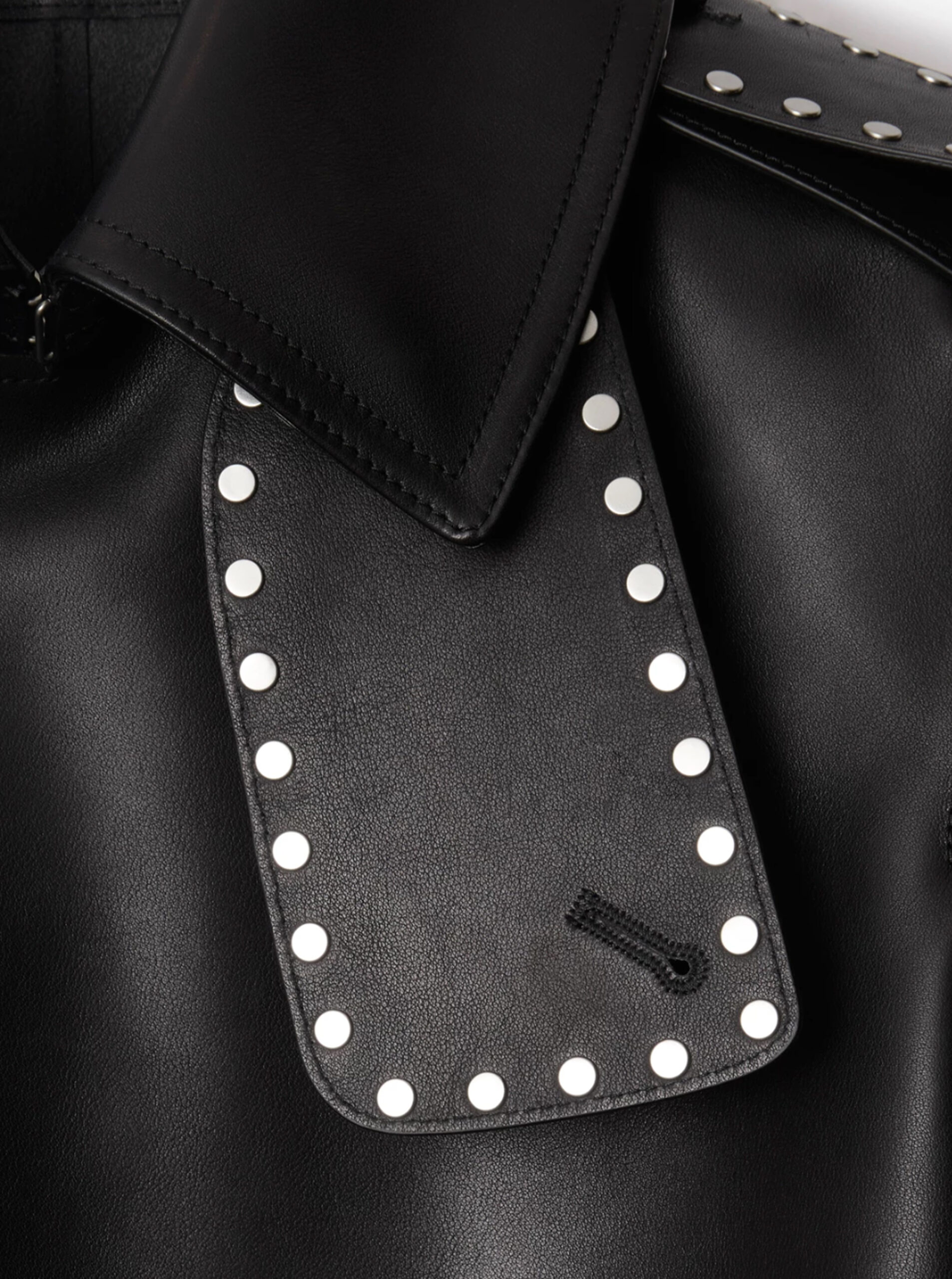 Studded Detailing: Polished metal studs highlight the collar, shoulder, and yoke for a modern edge.