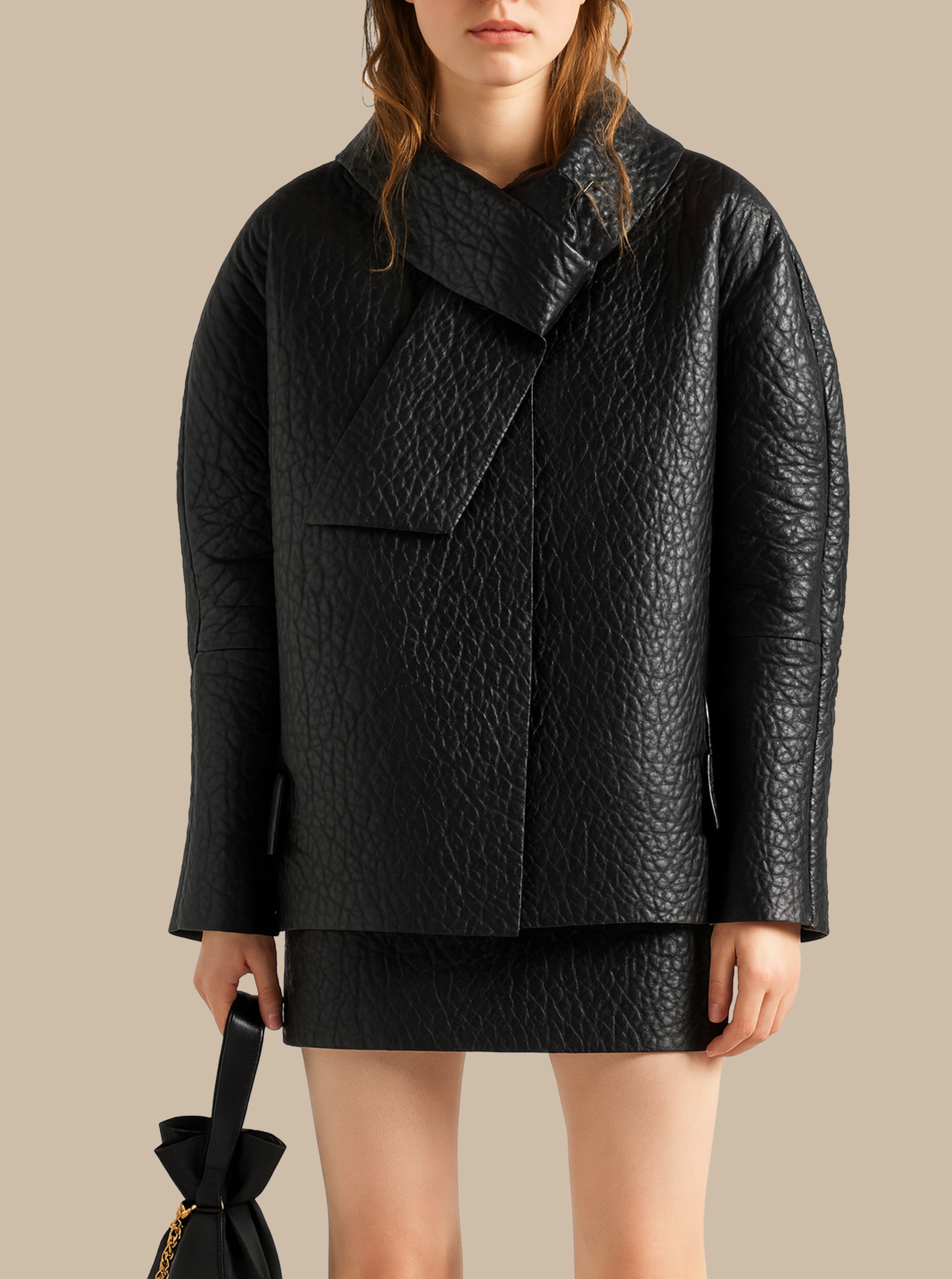 Elevate your edgy wardrobe with this Women’s Textured Leather Jacket. Boasting a distinctive crinkled leather finish and an artful asymmetric necktie detail, it blends bold style with refined craftsmanship. The cropped, relaxed silhouette adds a modern touch, making it a standout piece for adding cool sophistication to any outfit—from casual denim to tailored skirts.